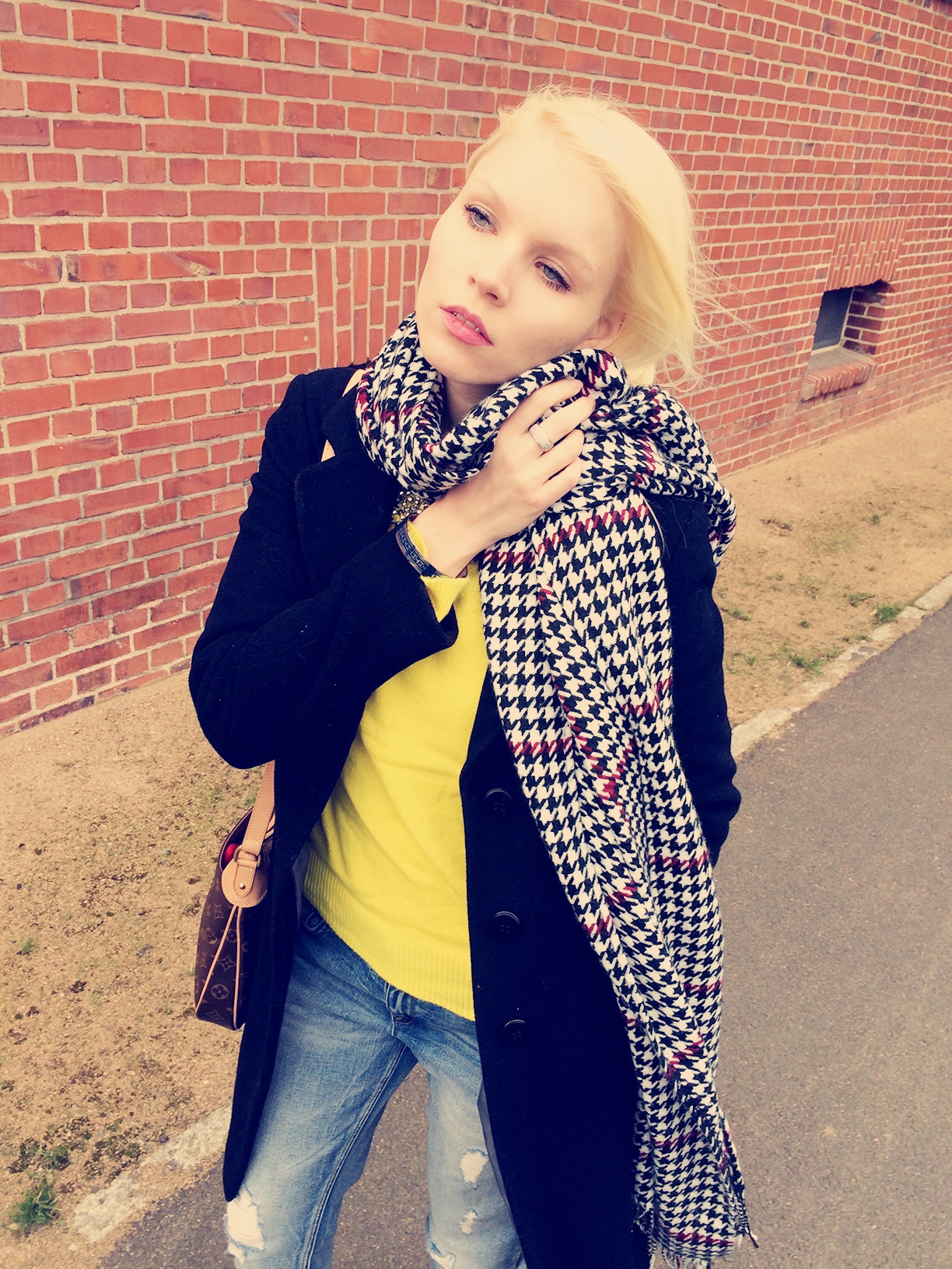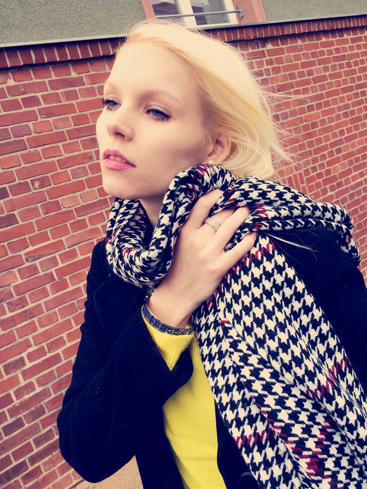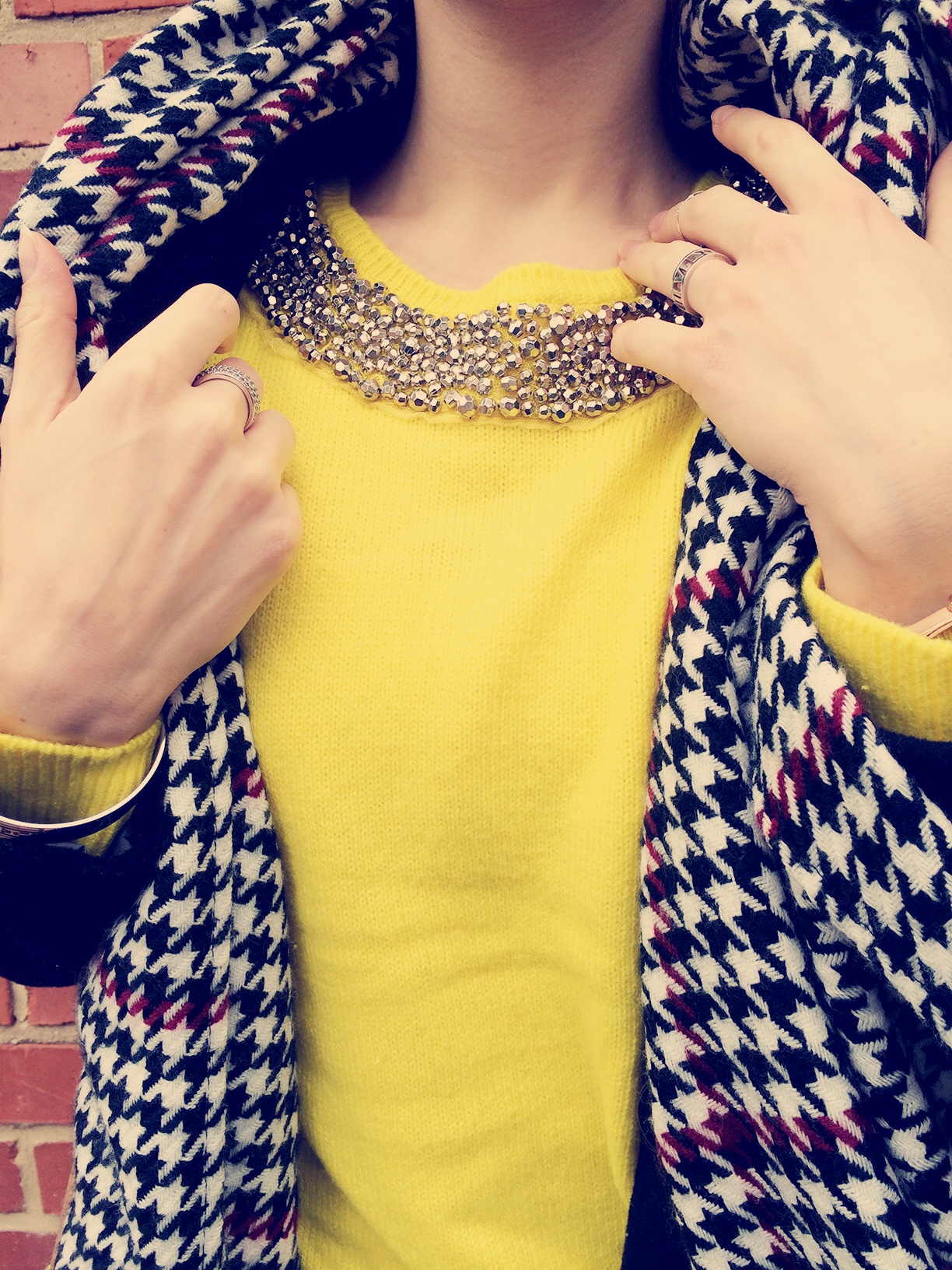 Your yellow sweater really suits you and i love it agains the houndstooth scarf. Very beautiful!