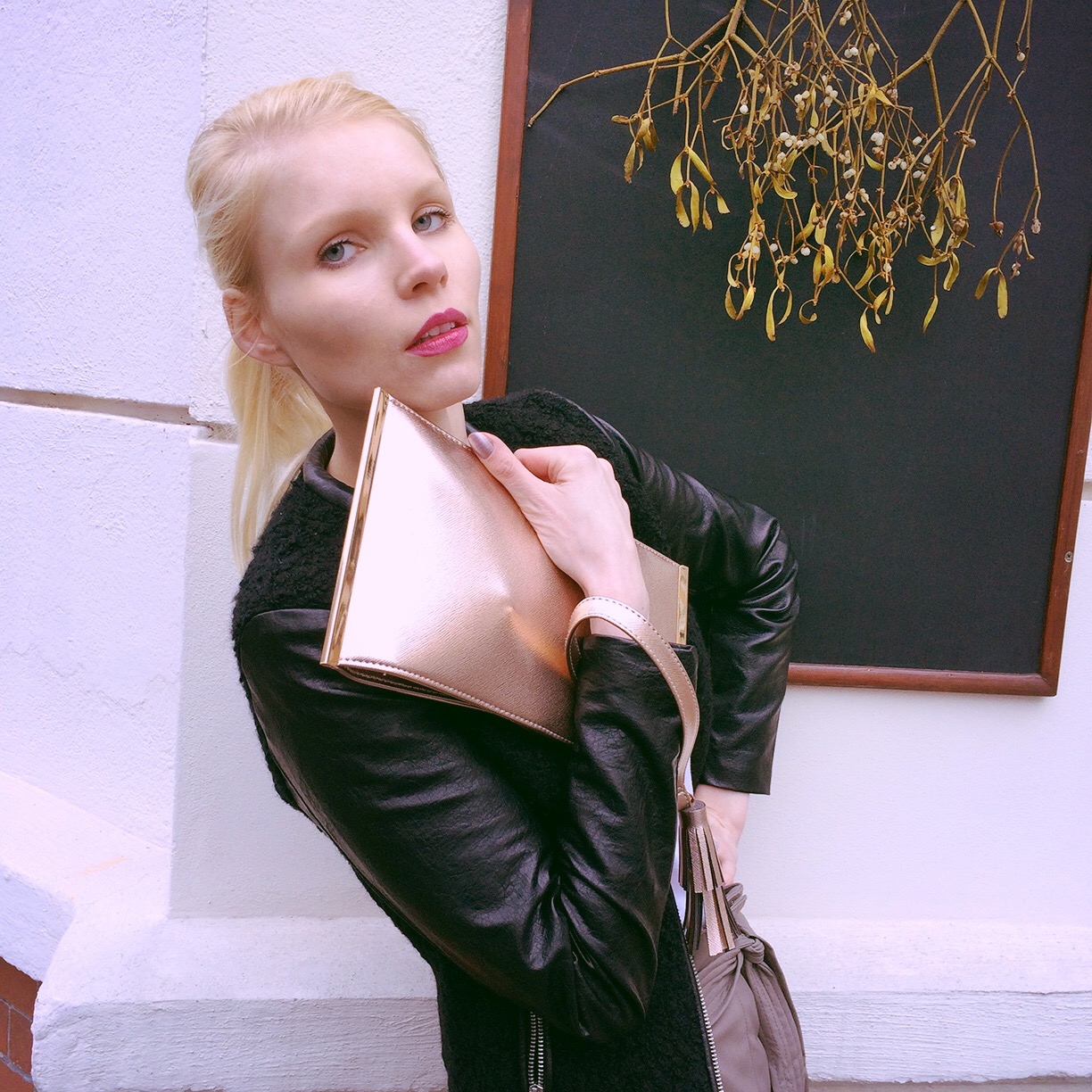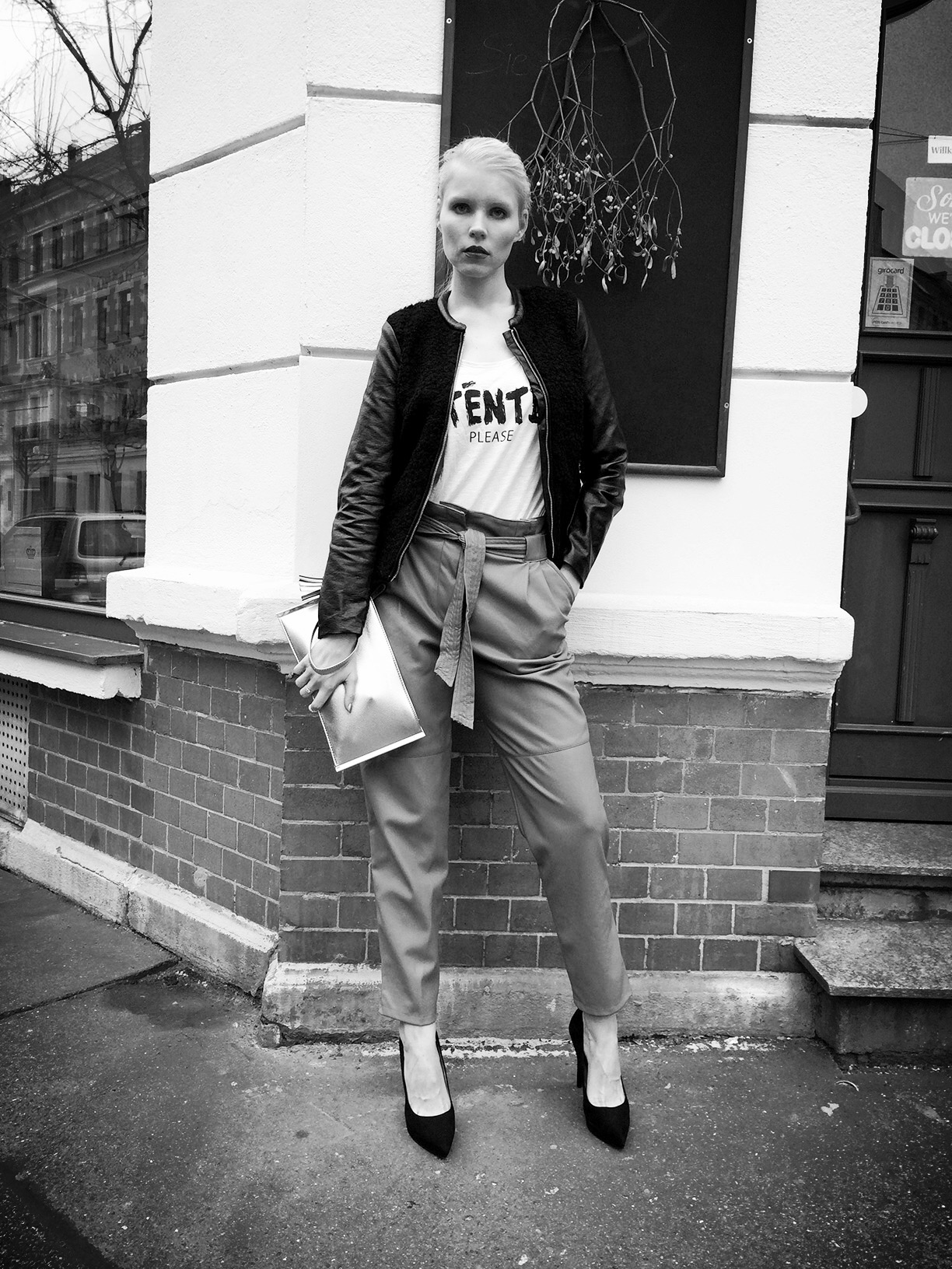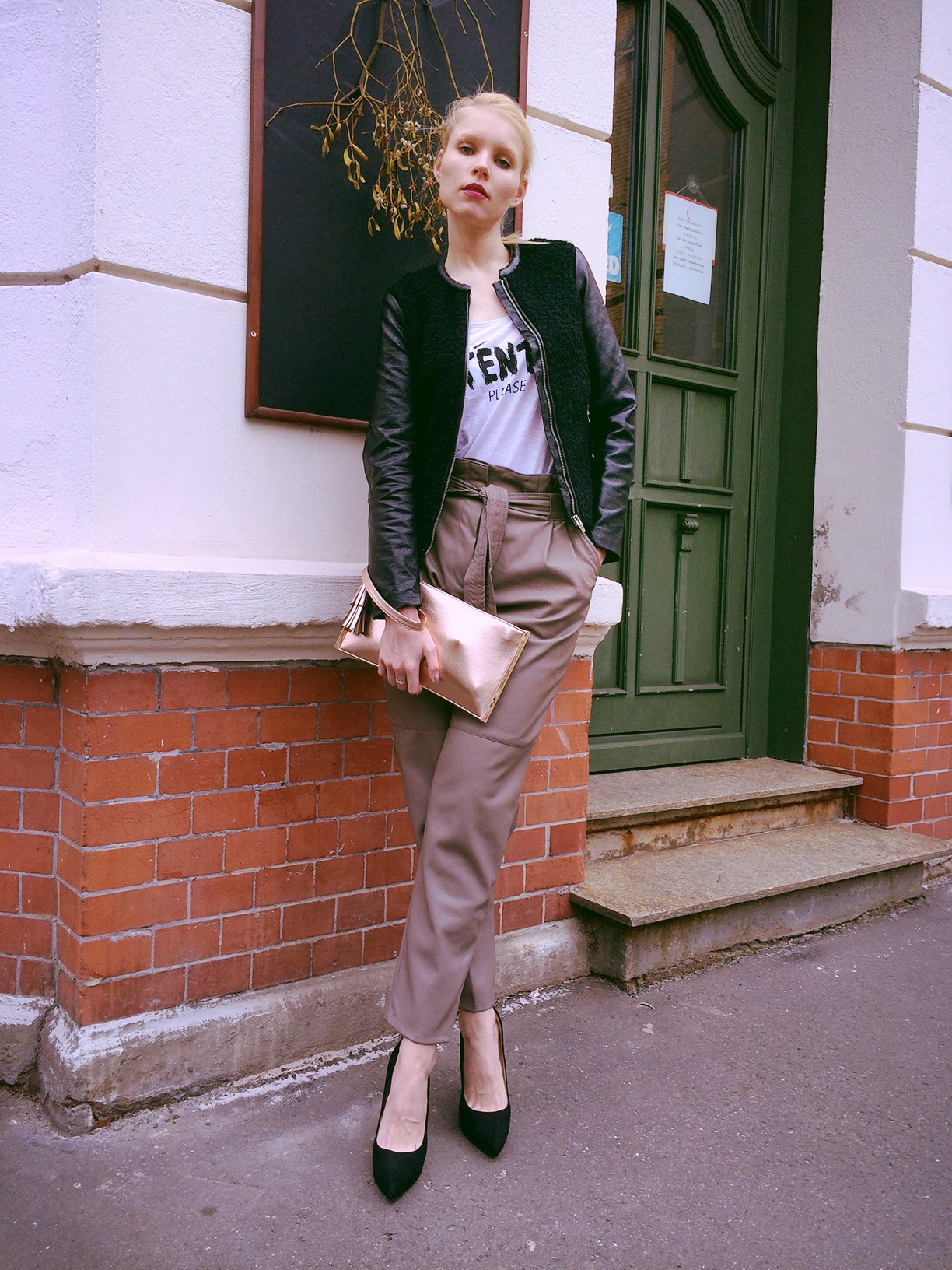 Natürlich ist Februar und Weihnachten schon längst vorbei, aber ab und zu findet man Mistelzweige in der Umgebung – so wie ich als ich einen Platz zum Fotografieren meines Samstag-Abendlooks suchte. Dieses Wochenende war viel zu kurz und ich war in der Stadt zu einem Event eingeladen, so dass der Sonntag sich mehr nach Stunden als nach einem ganzen Tag anfühlte. Für die Party habe ich meine graue High-Waist-Fake-Lederhose angezogen. Ich liebe den lockeren Schnitt so sehr und dass man sie sowohl mit Heels als auch Sneakern kombinieren kann.