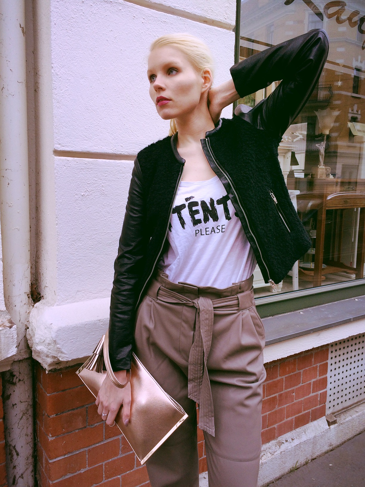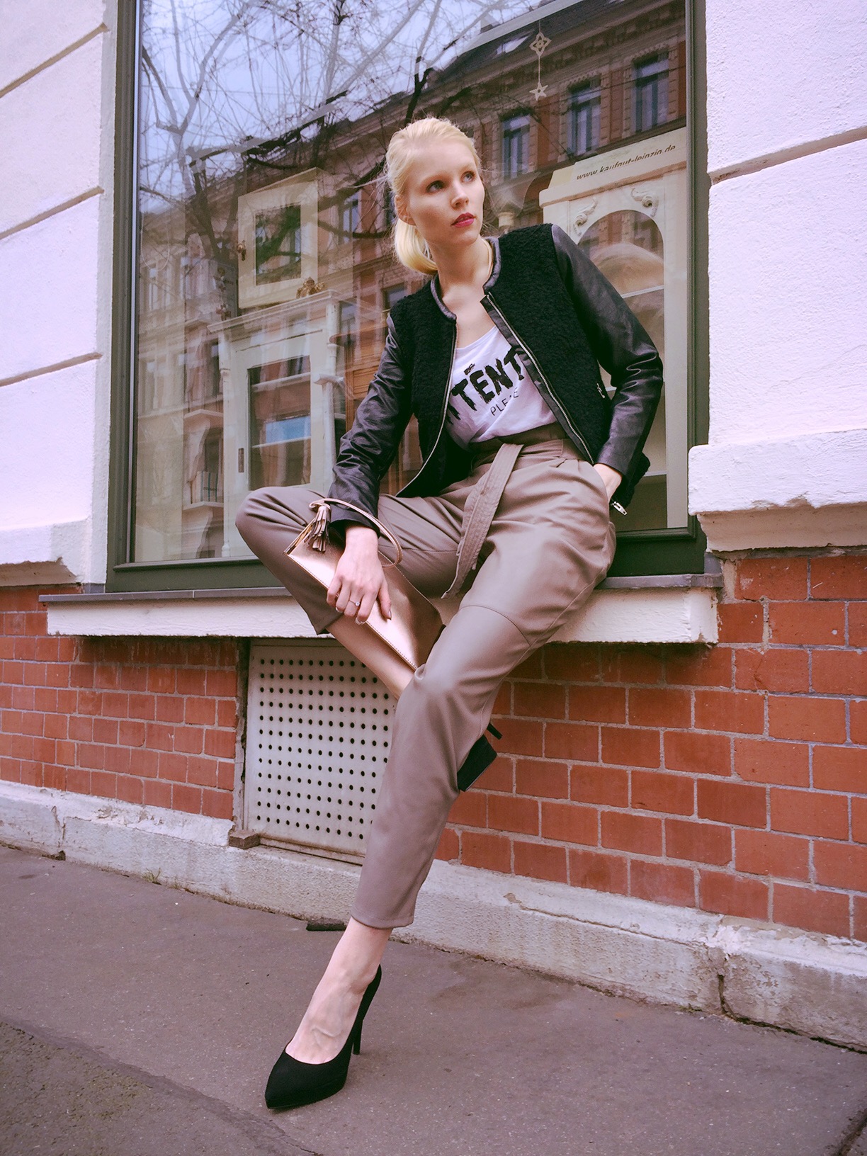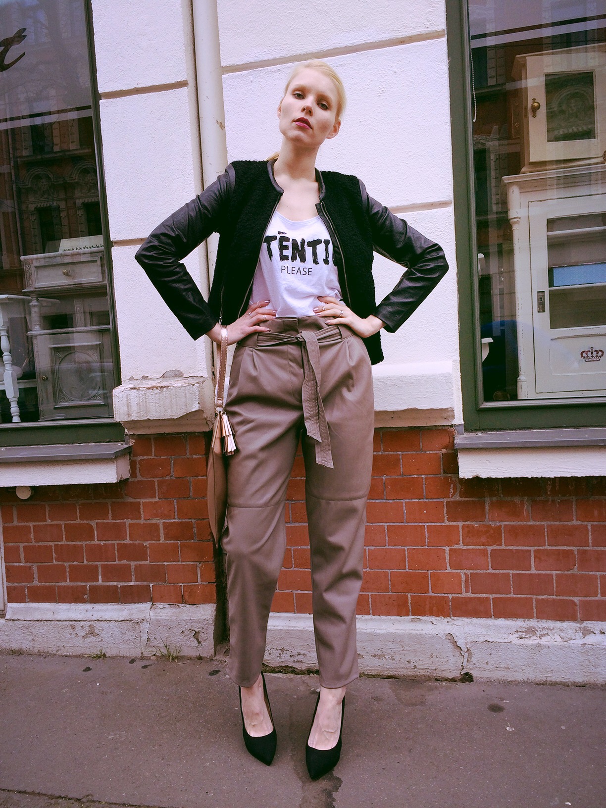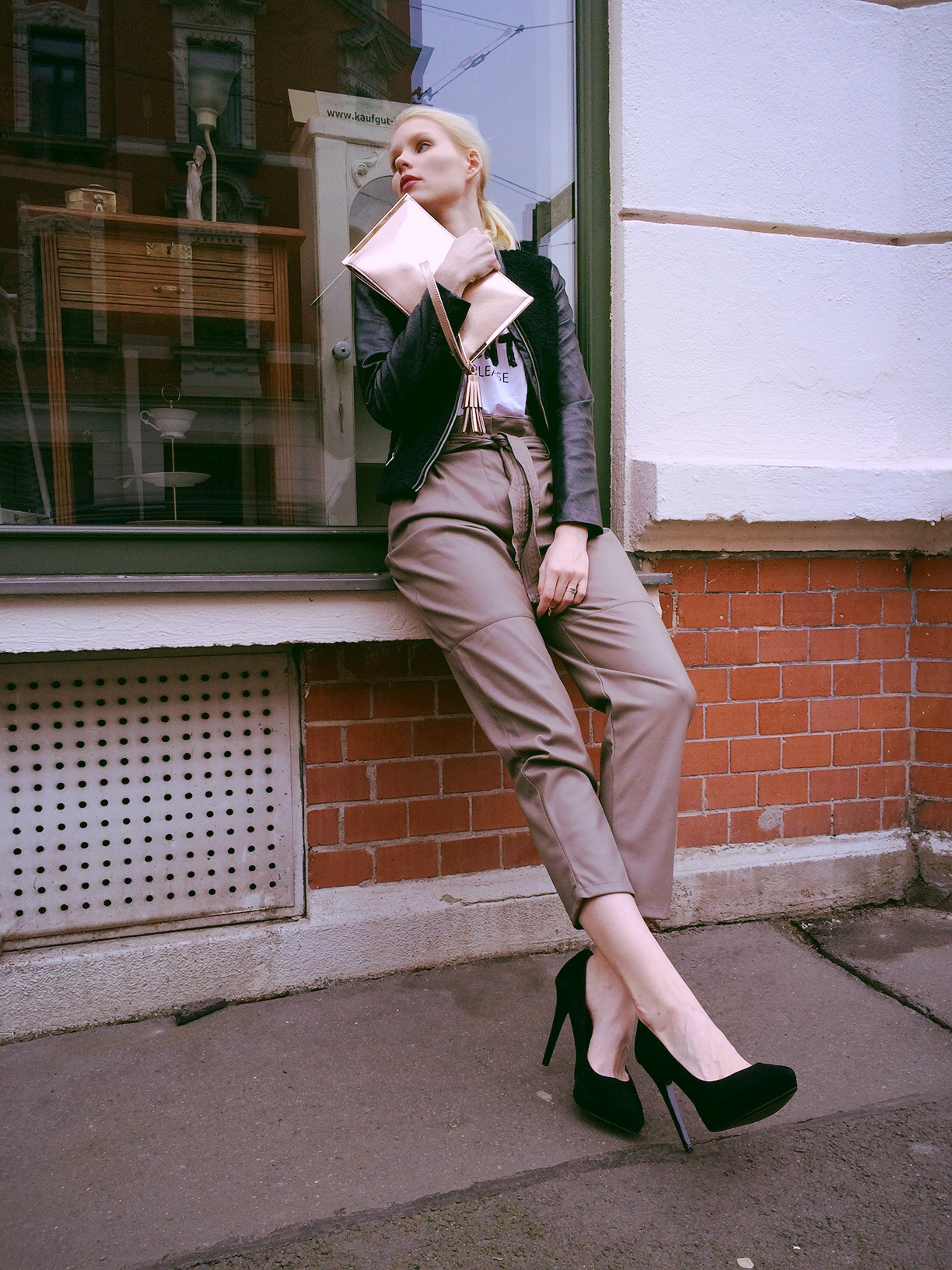 Natürlich ist Februar und Weihnachten schon längst vorbei, aber ab und zu findet man Mistelzweige in der Umgebung – so wie ich als ich einen Platz zum Fotografieren meines Samstag-Abendlooks suchte. Dieses Wochenende war viel zu kurz und ich war in der Stadt zu einem Event eingeladen, so dass der Sonntag sich mehr nach Stunden als nach einem ganzen Tag anfühlte. Für die Party habe ich meine graue High-Waist-Fake-Lederhose angezogen. Ich liebe den lockeren Schnitt so sehr und dass man sie sowohl mit Heels als auch Sneakern kombinieren kann.