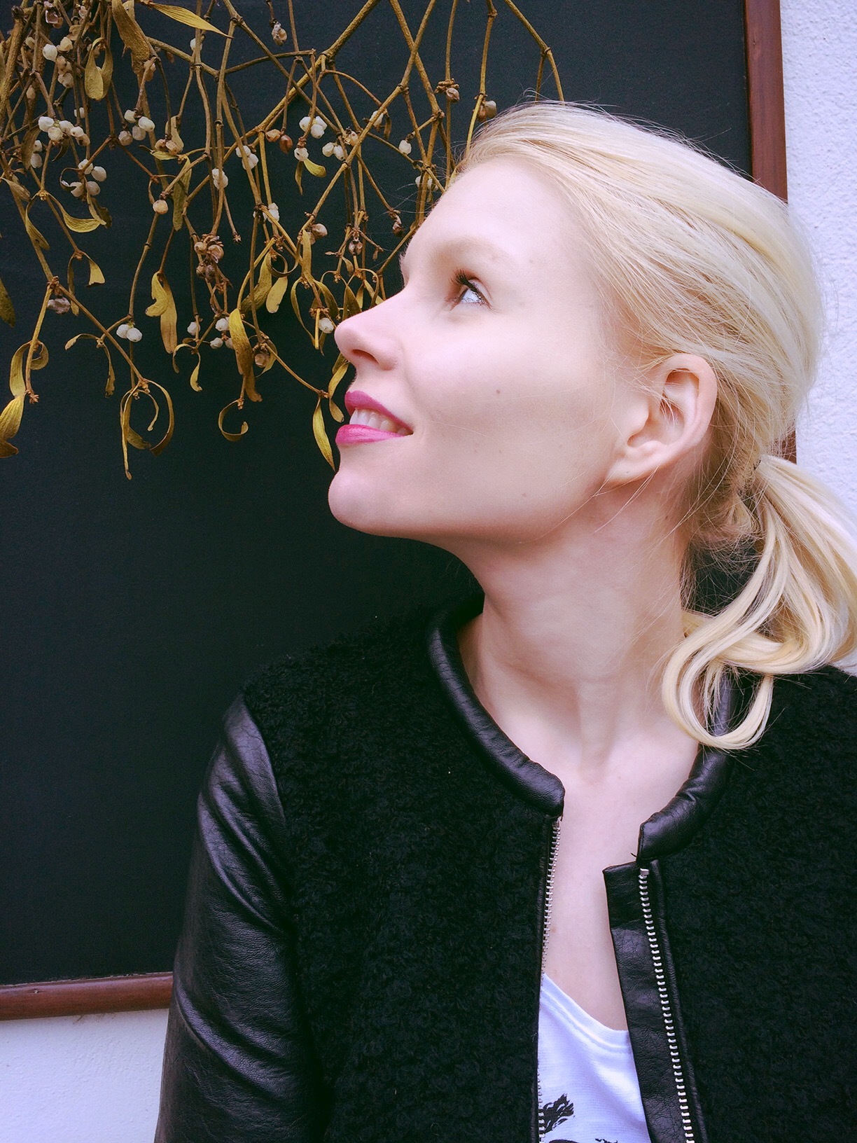 Das Outfit sieht wirklich toll aus! Mir gefällt die Fake Lederhose. Der Schnitt ist wirklich klasse und passt perfekt zu dem Top. Wie schön das du noch einen Mistelzweig gefunden hast :)
