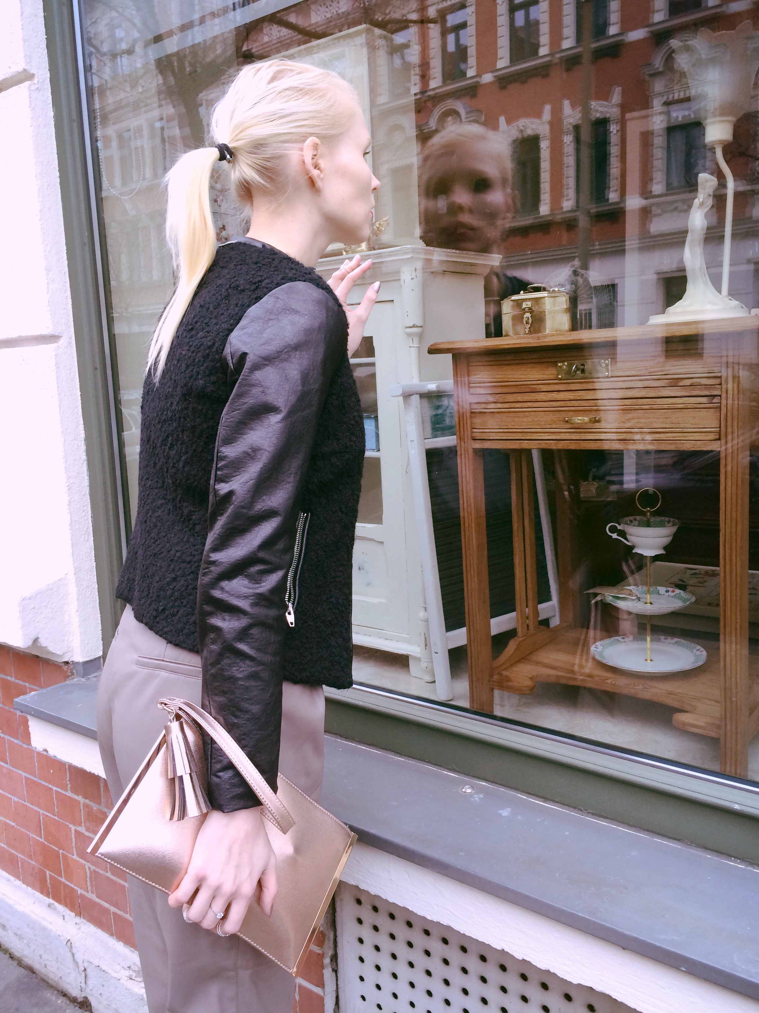 Of course it’s February and Christmas time is over but now and then one can find mistletoes in the neighborhood – like me when I looked for a shooting place for my Saturday’s evening look. This weekend was too short and I had been to a little event in the center, so that Sunday felt more like hours instead of a whole day. For the party I took out my grey high waist faux leather pants. I love the lose fit so much and that you can combine it with heels as well as sneakers.