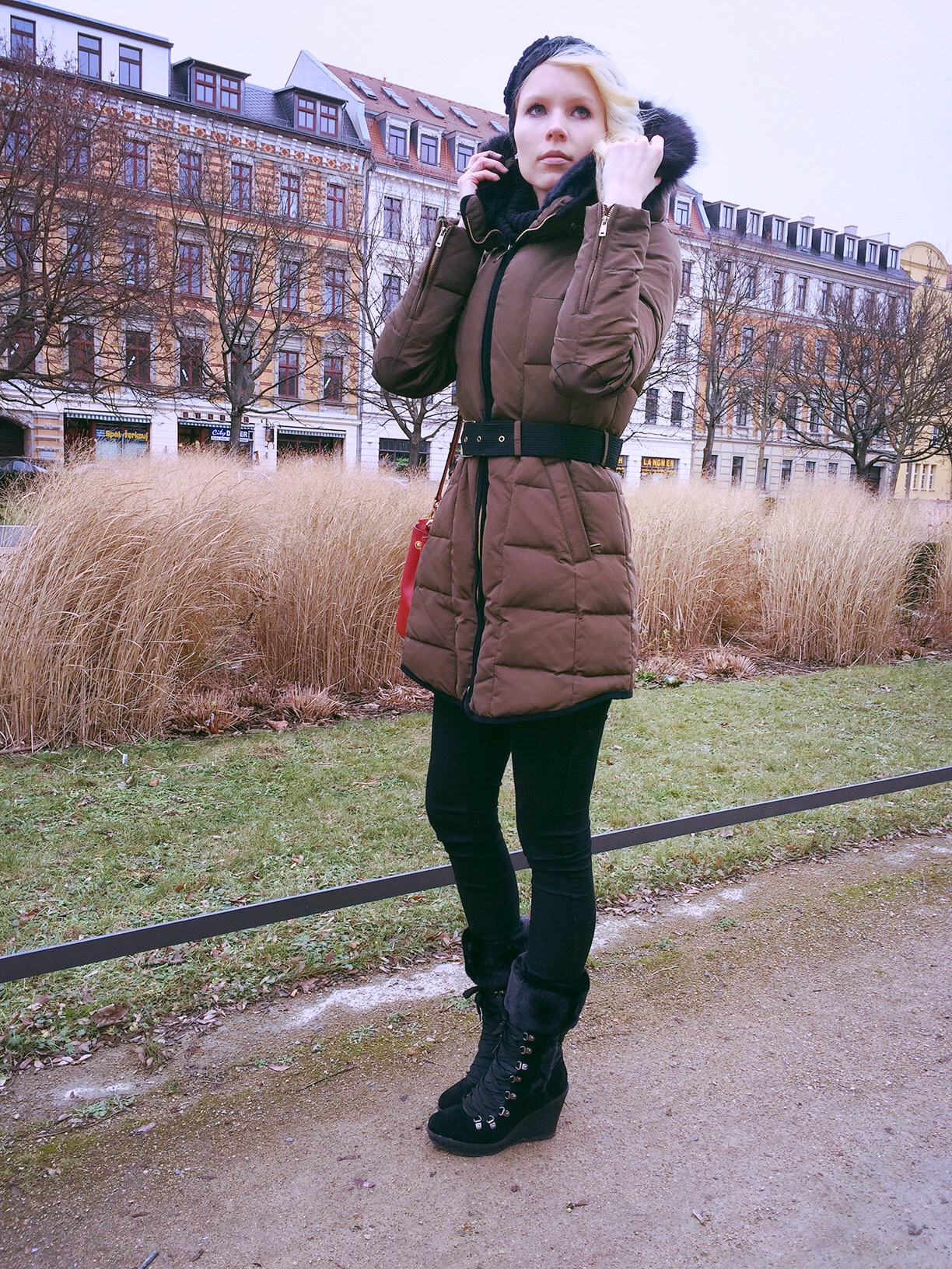 Love the chic puffy style and pretty fur cape design of the coat! Gorgeous bag too, the bright pop of red is amazing!