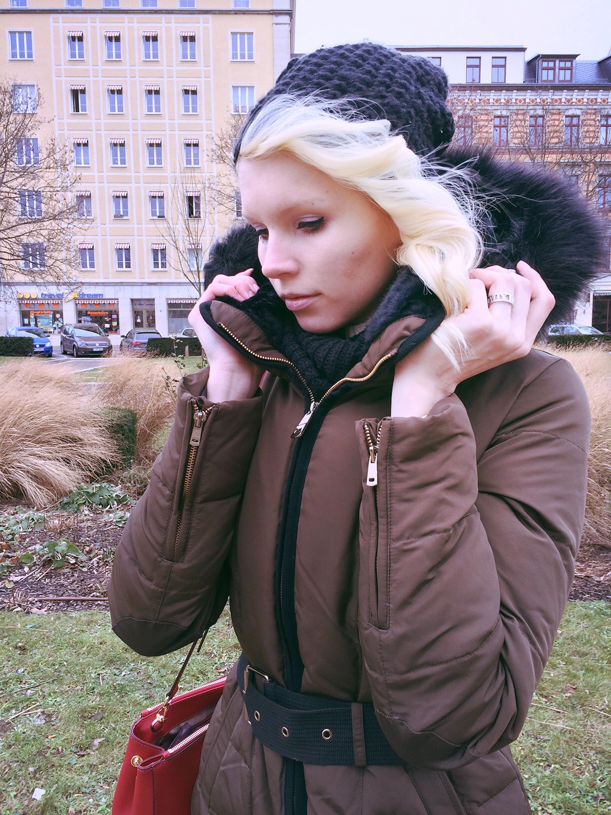 You look great! That jacket looks so warm and cozy and I love the color of your bag.