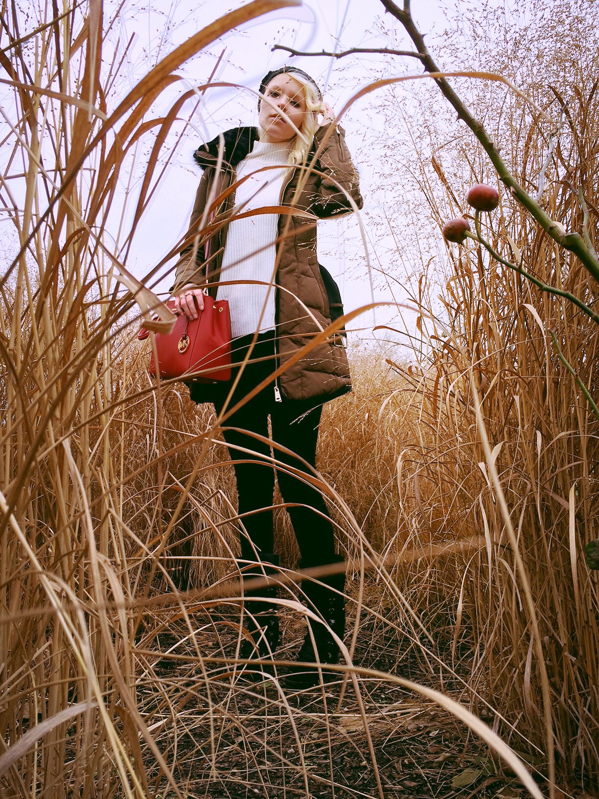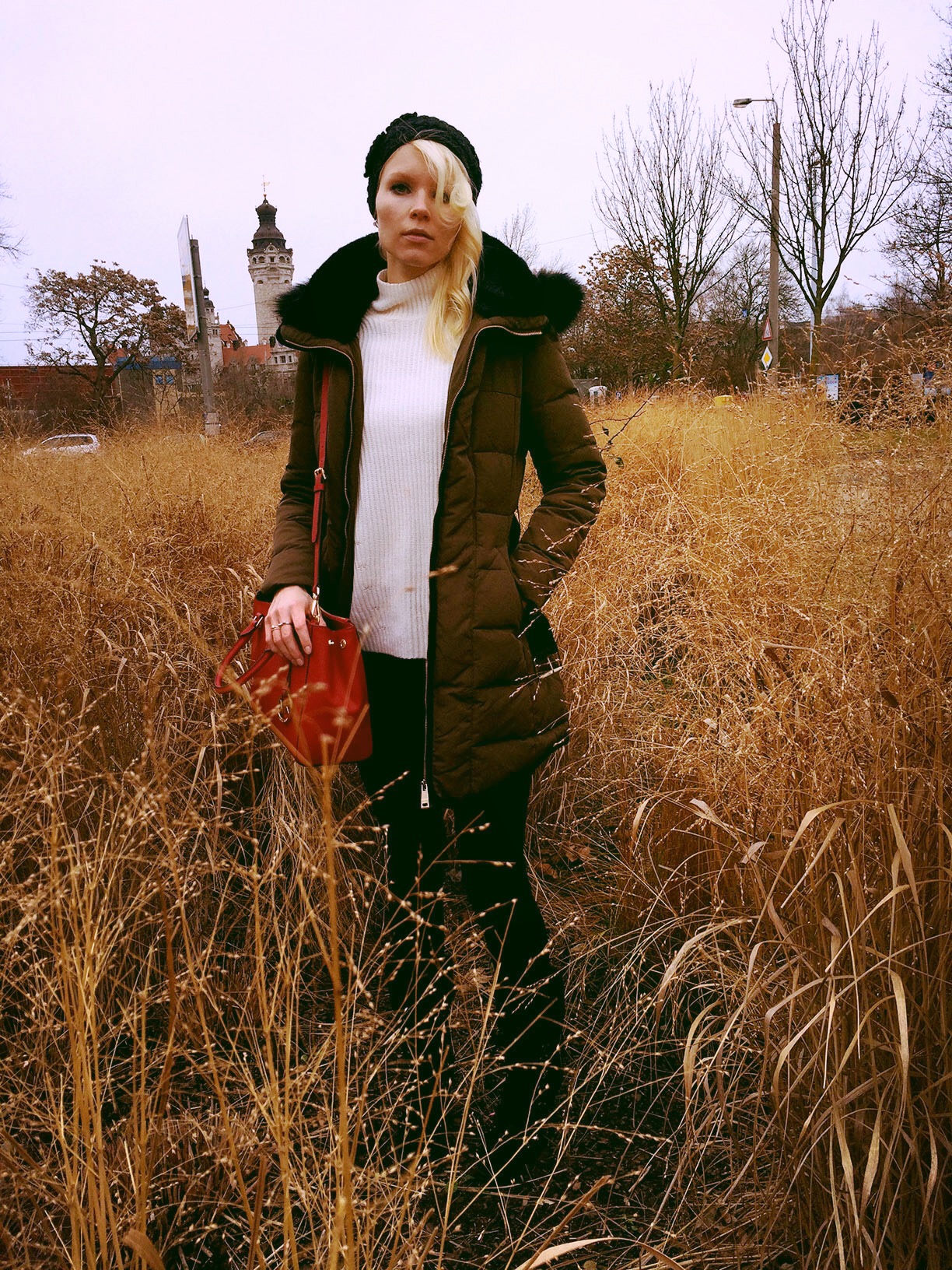 Love the red bag with the neutral colors! You look warm, cozy, and fabulous!!