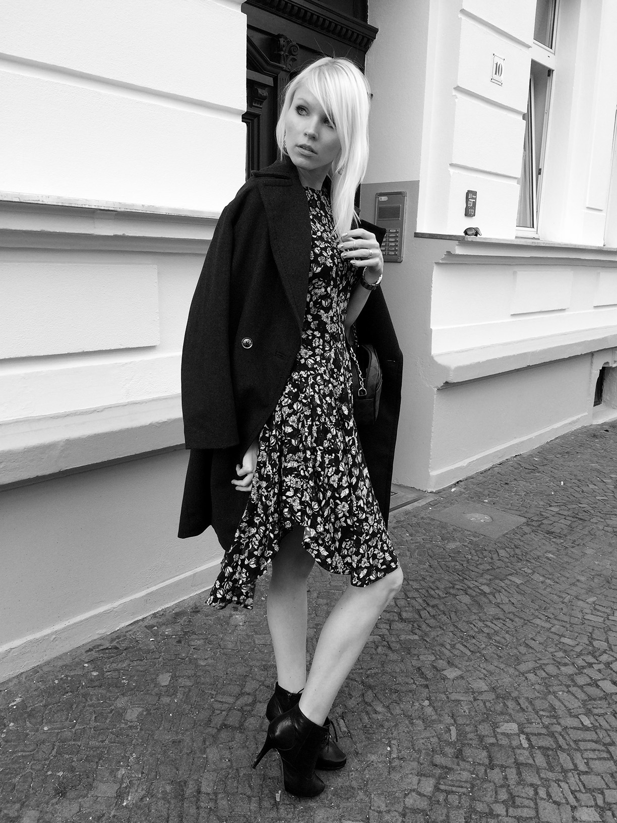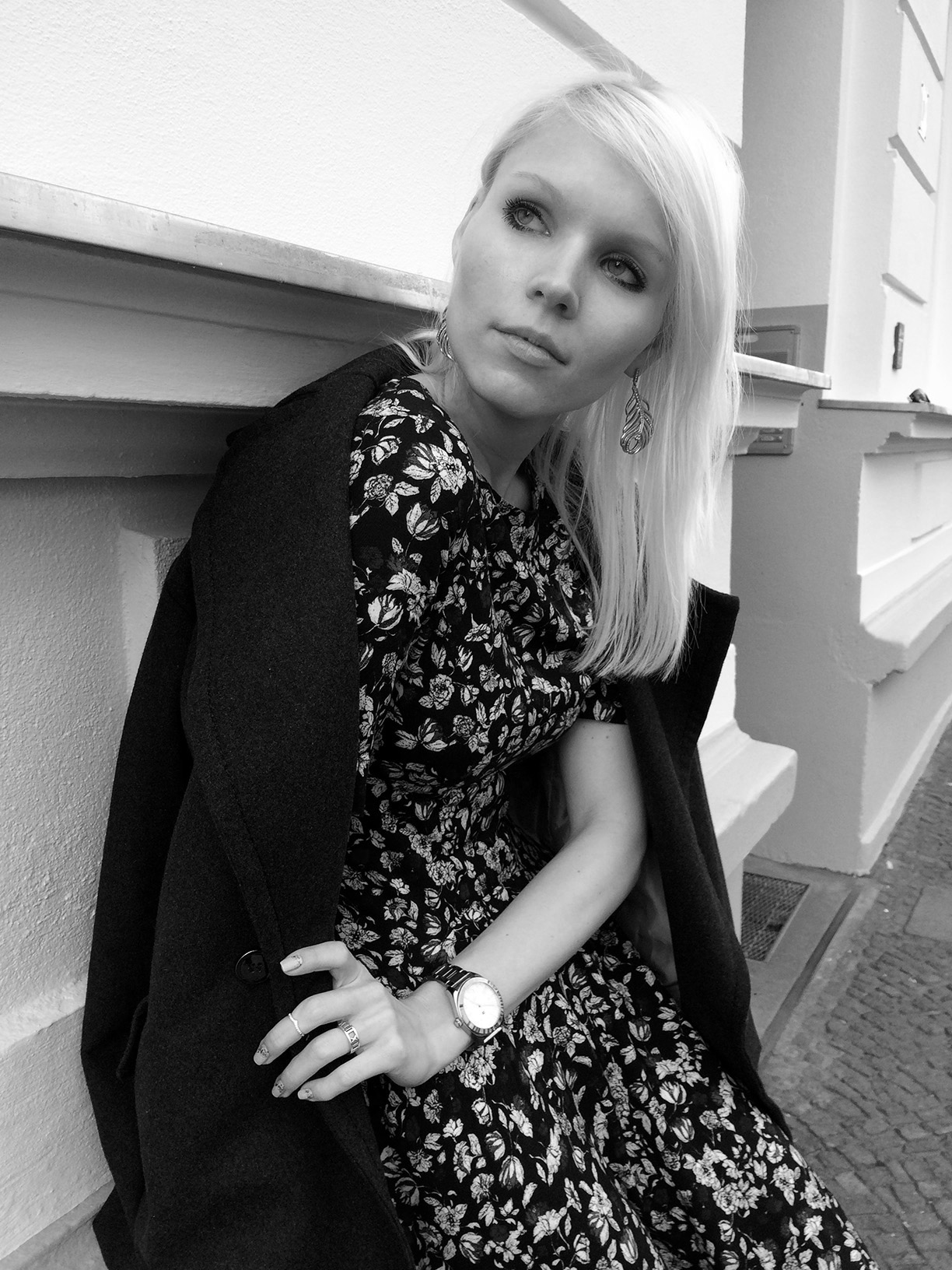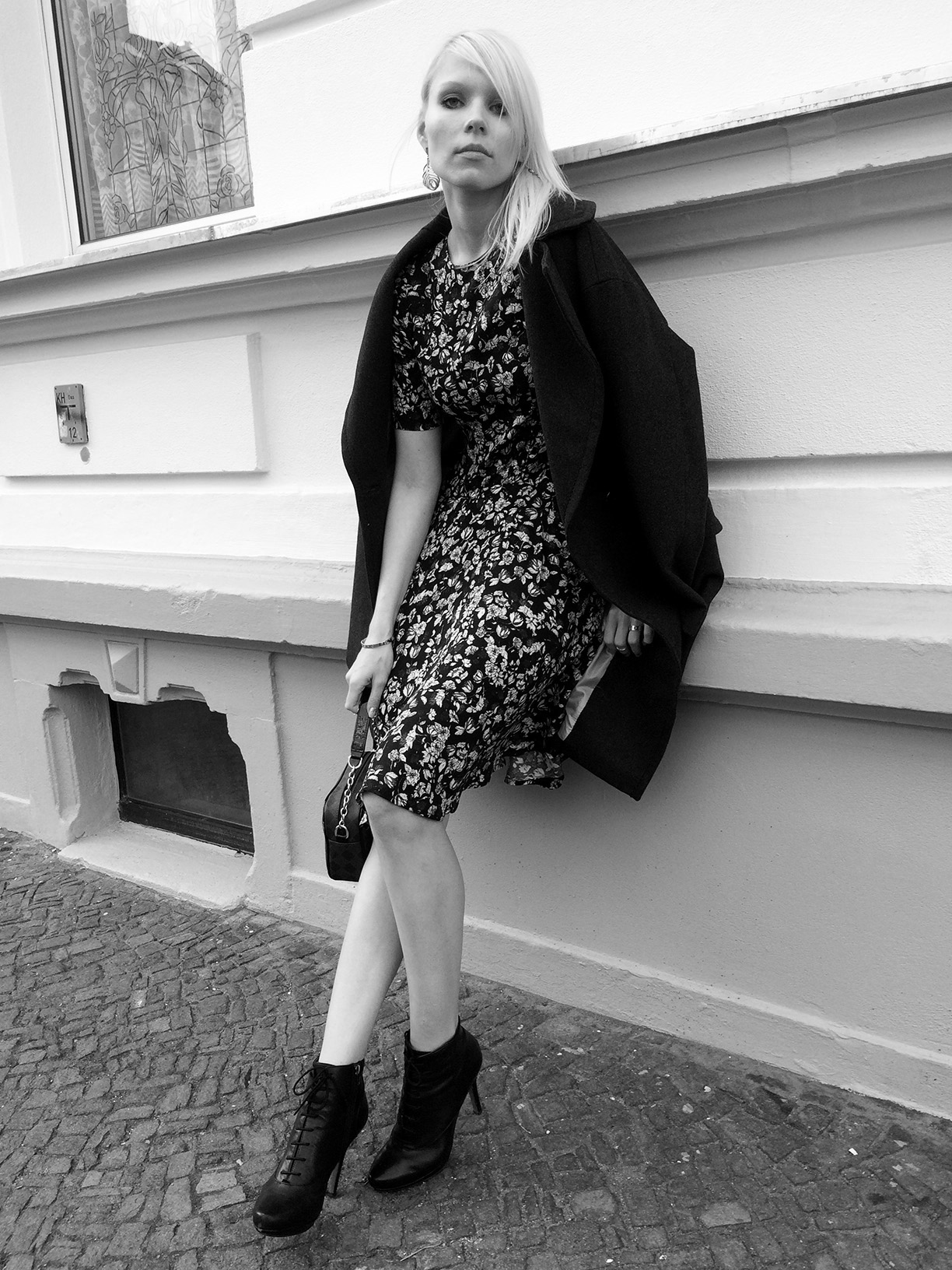I love the coat n the print of ur dress ,nice photo effect too .