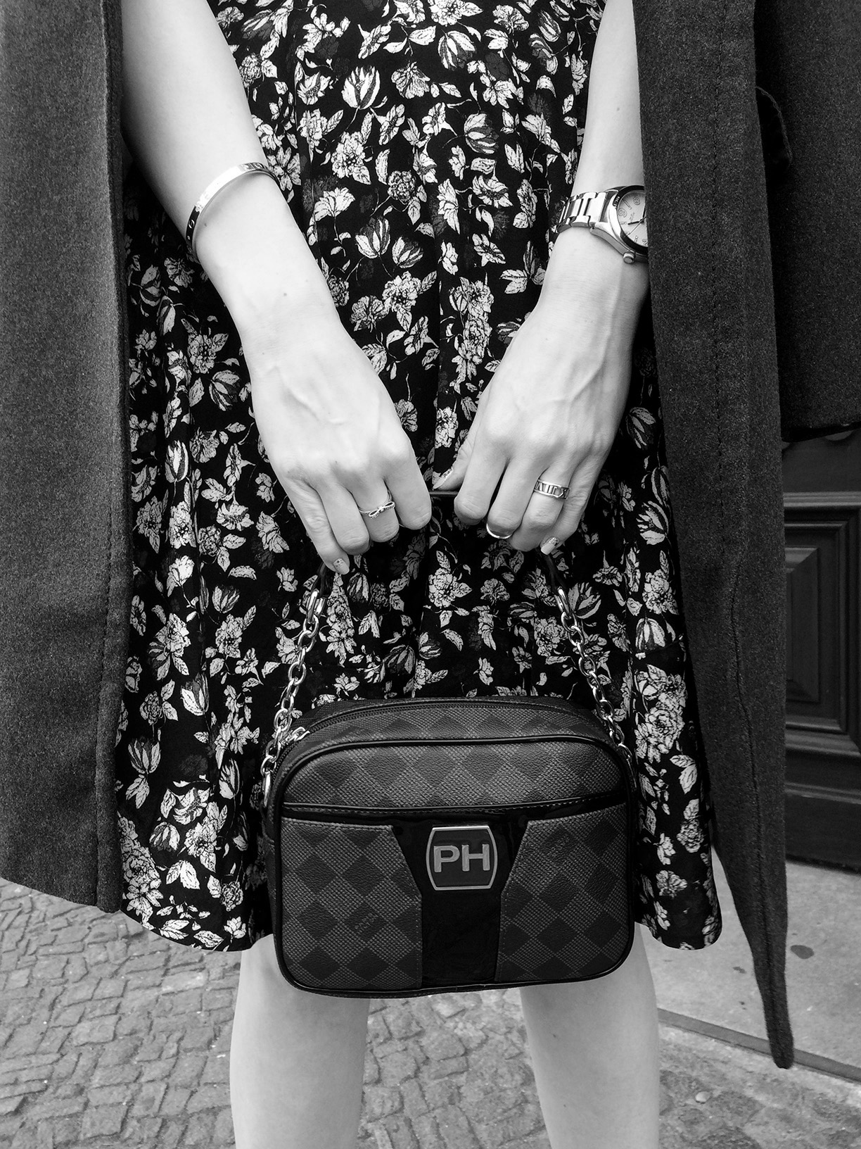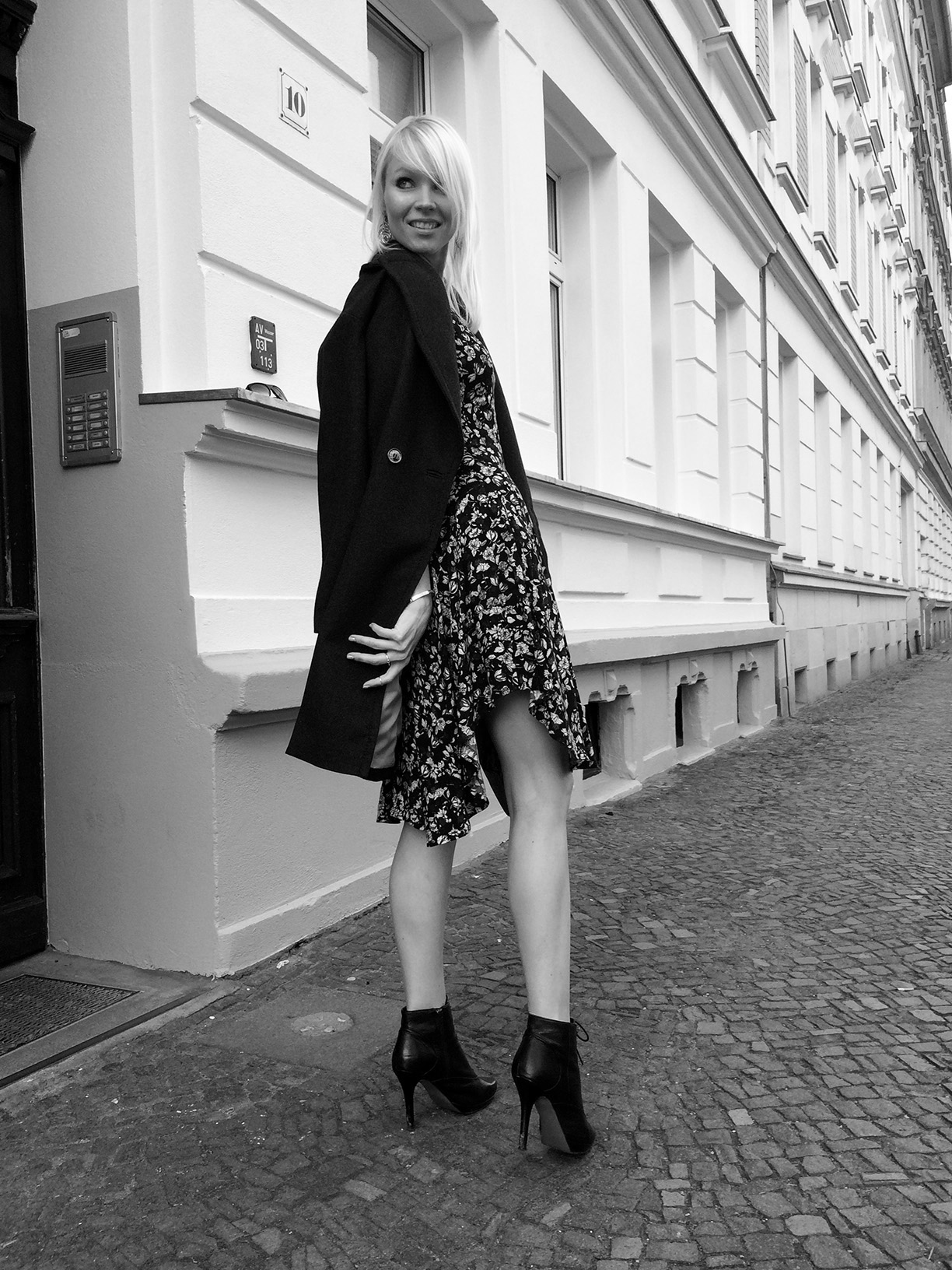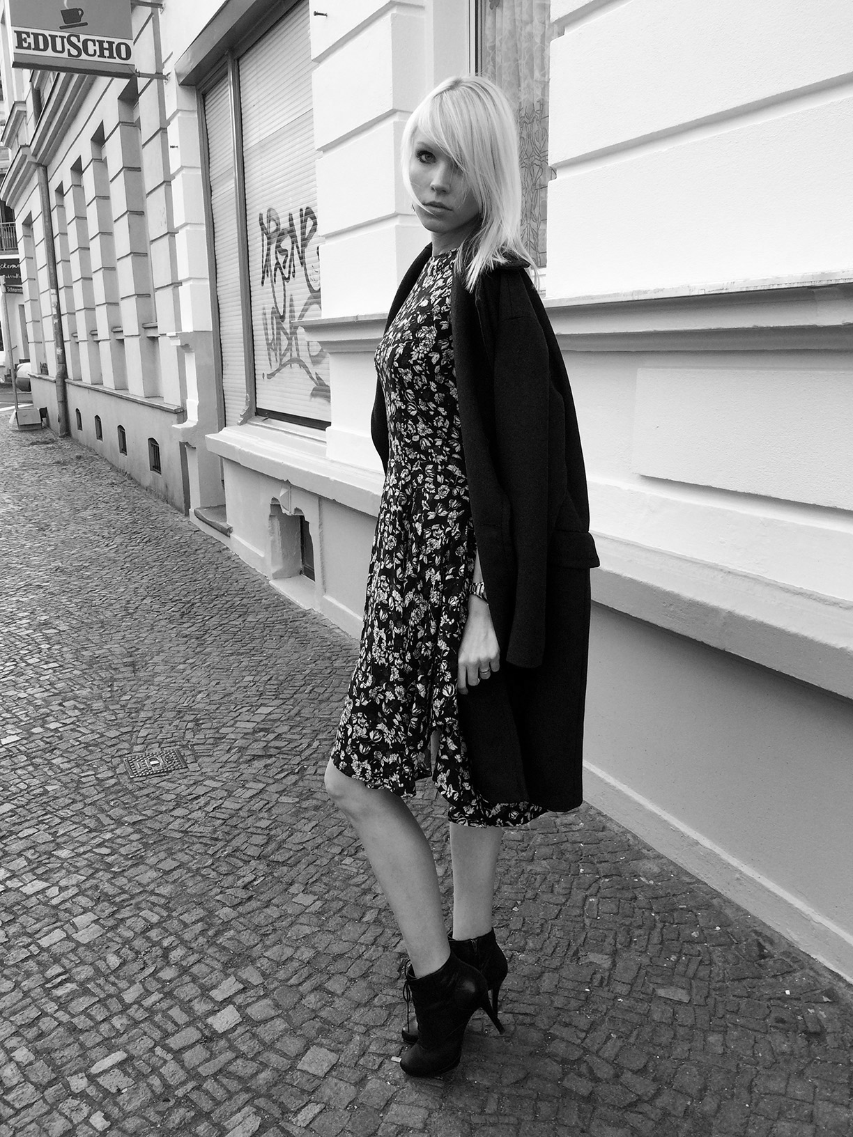 I love the coat n the print of ur dress ,nice photo effect too .