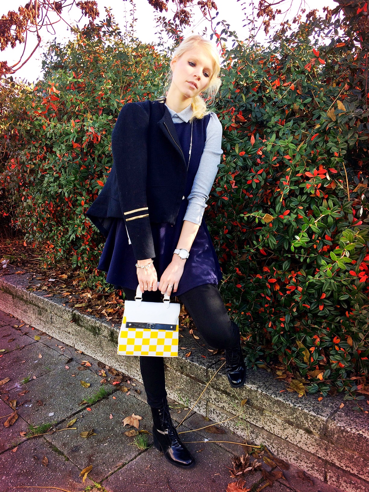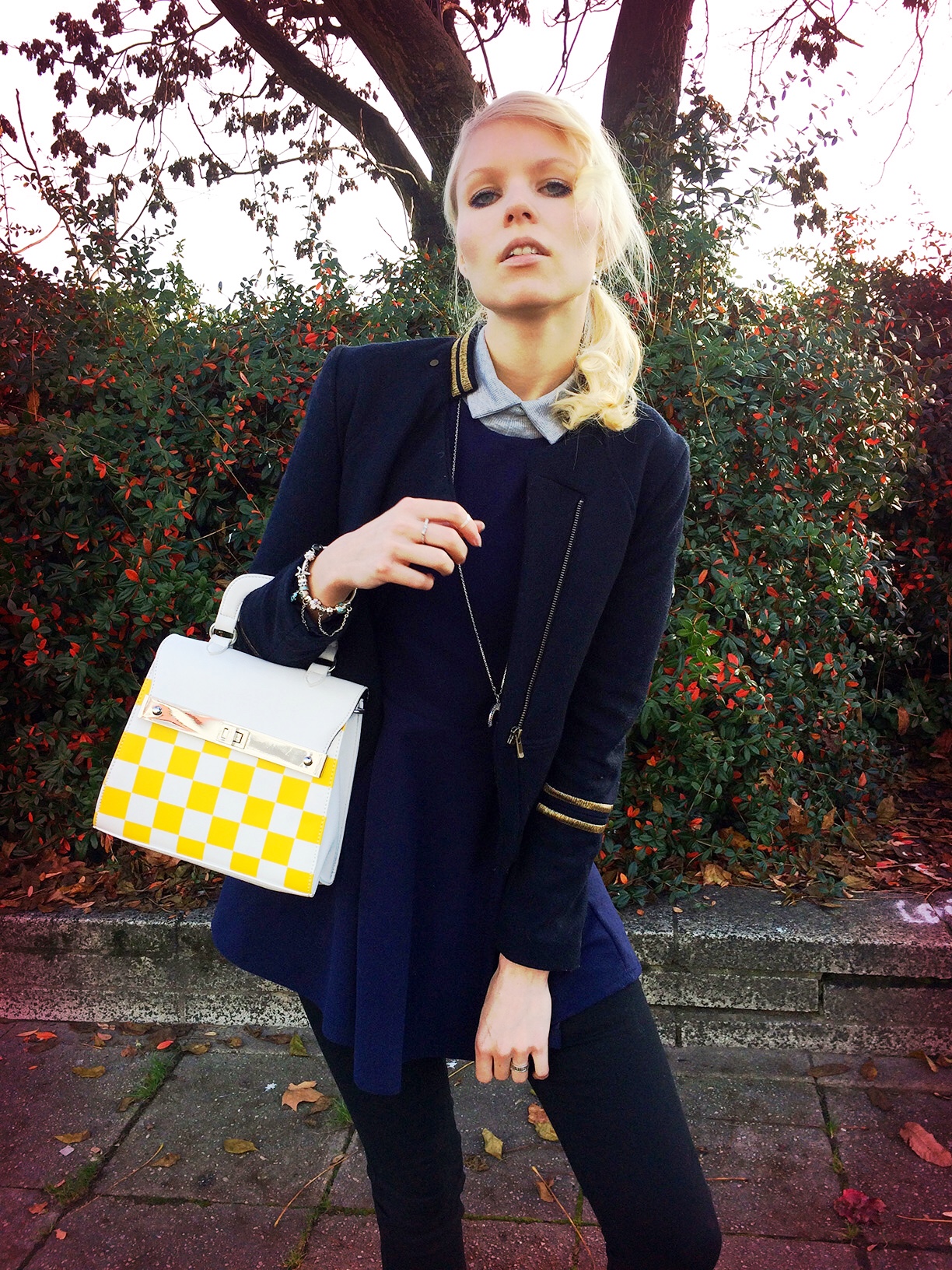 Love the cobalt blue with that very cool checked bag from Asos.