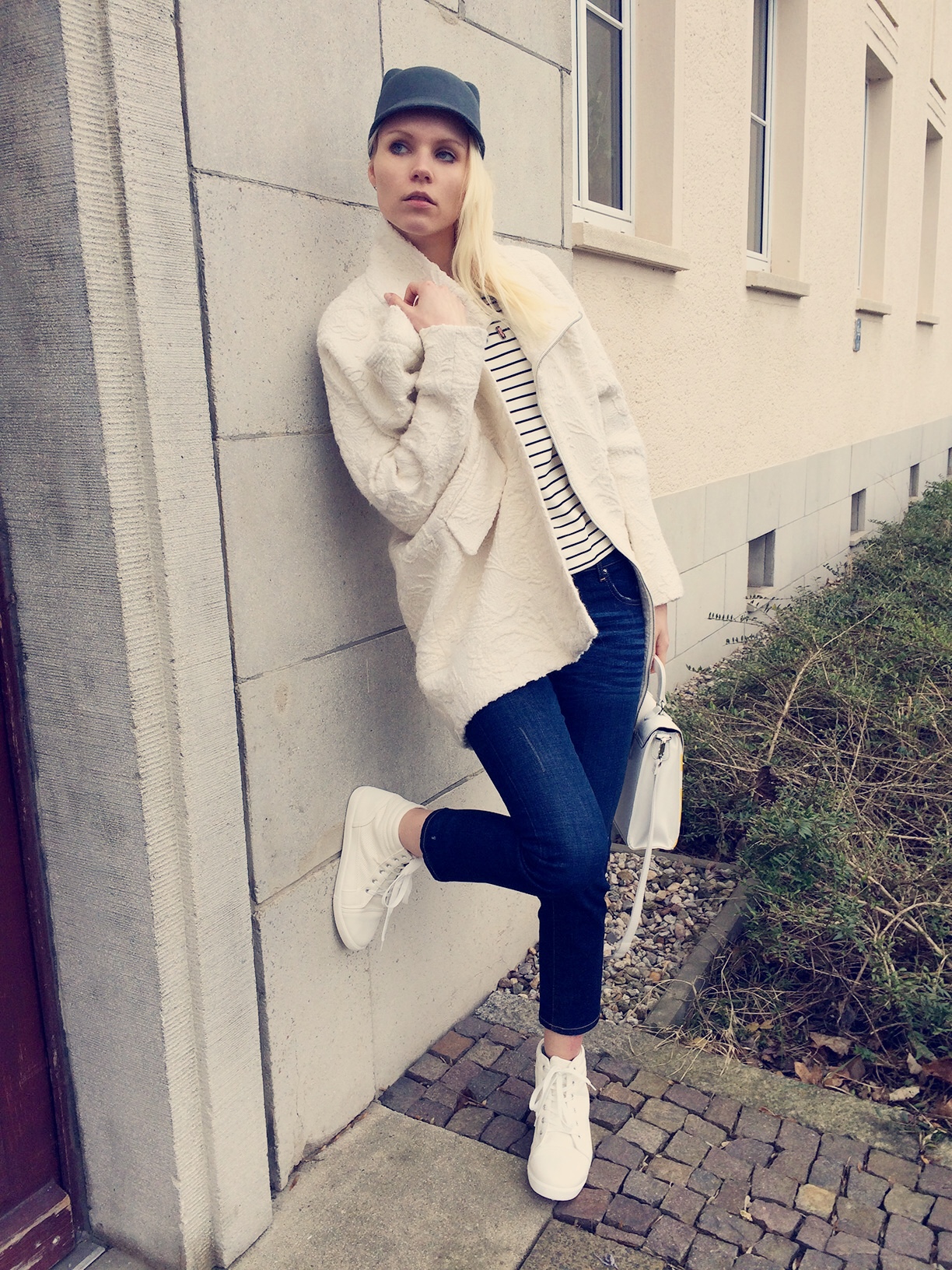 Bloß gut, dass Du gefragt wurdest, ob Du mitmachen möchtest, denn sonst hättest Du dieses super Outfit sicher nicht gezeigt! Gefällt mir wieder außerordentlich gut: der Mantel ist echt ein traum und mit dem Ringelshirt drunter so wunderbar frisch. Die Sneakers sind natürlich auch total klasse! Wünsch Dir von Herzen ein wunderbares Wochenende!
