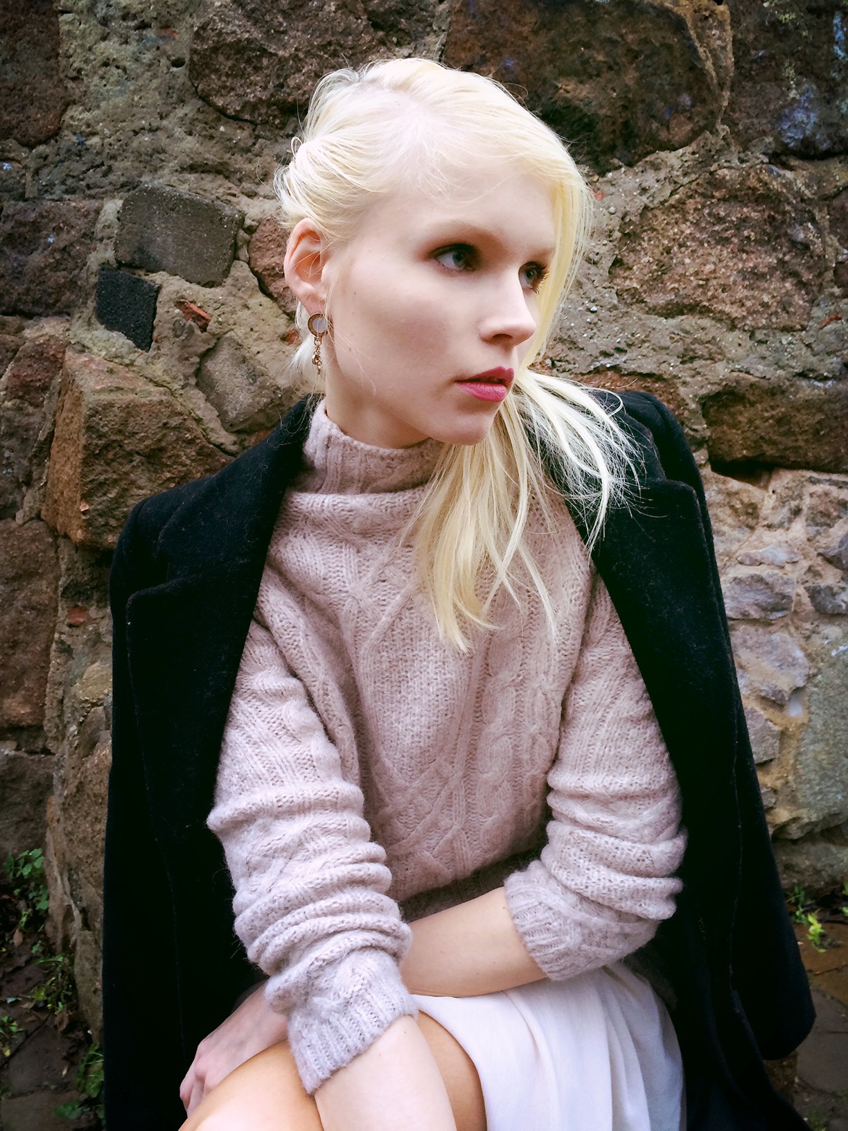 I adore the way your fair skin and hair reflect the pale pink of the sweater and skirt! Perfectly lovely.